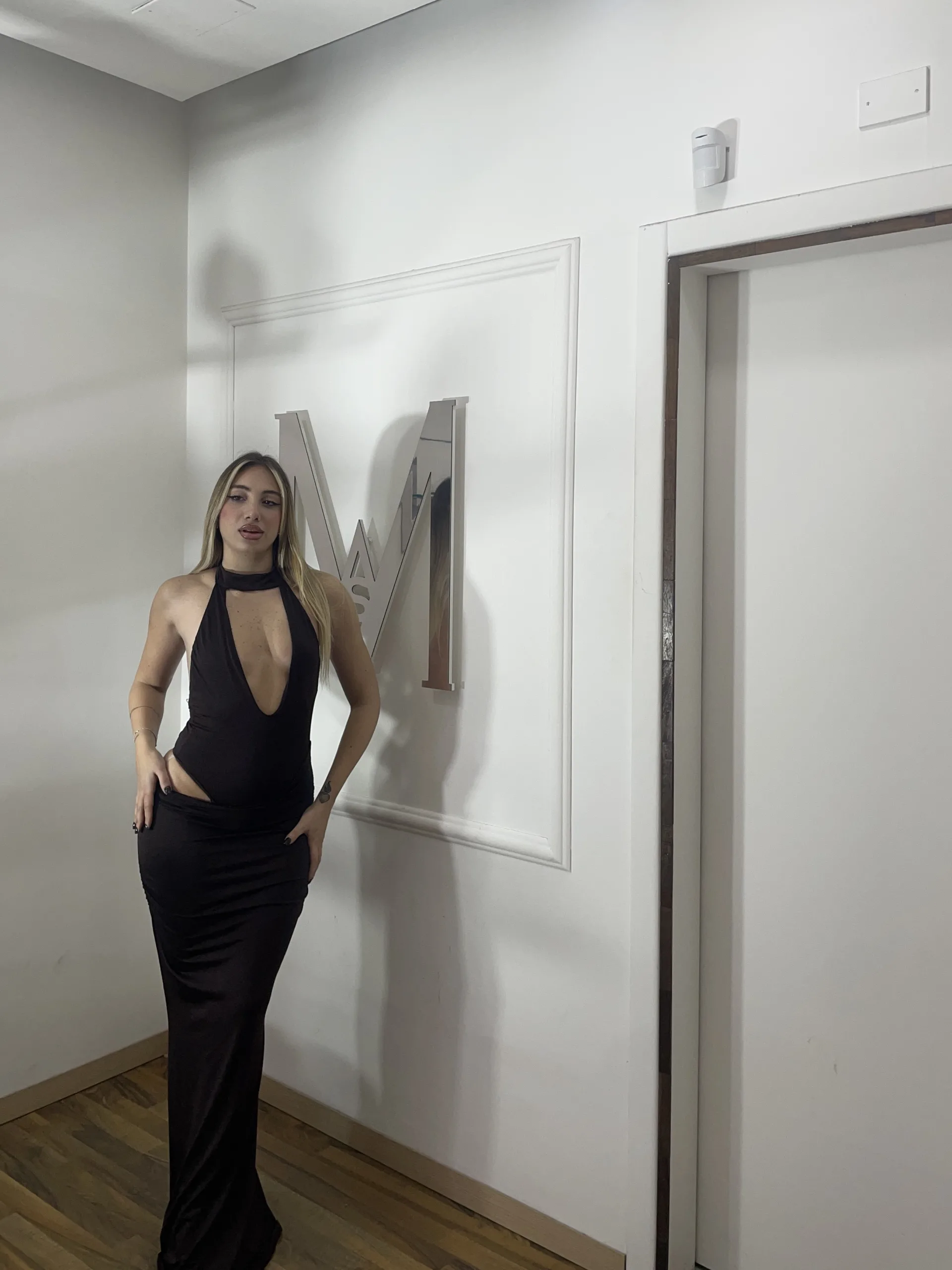 Abito lungo con scollo profondo, vestibilità aderente ed elasticizzata. Taglia unica.