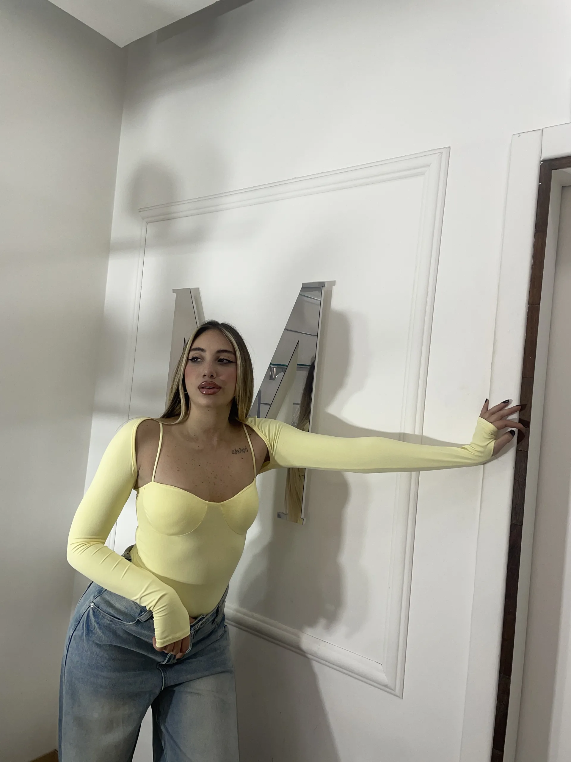 Body con coprispalle integrato e coppe sagomate. Vestibilità aderente ed elasticizzata, taglia unica.