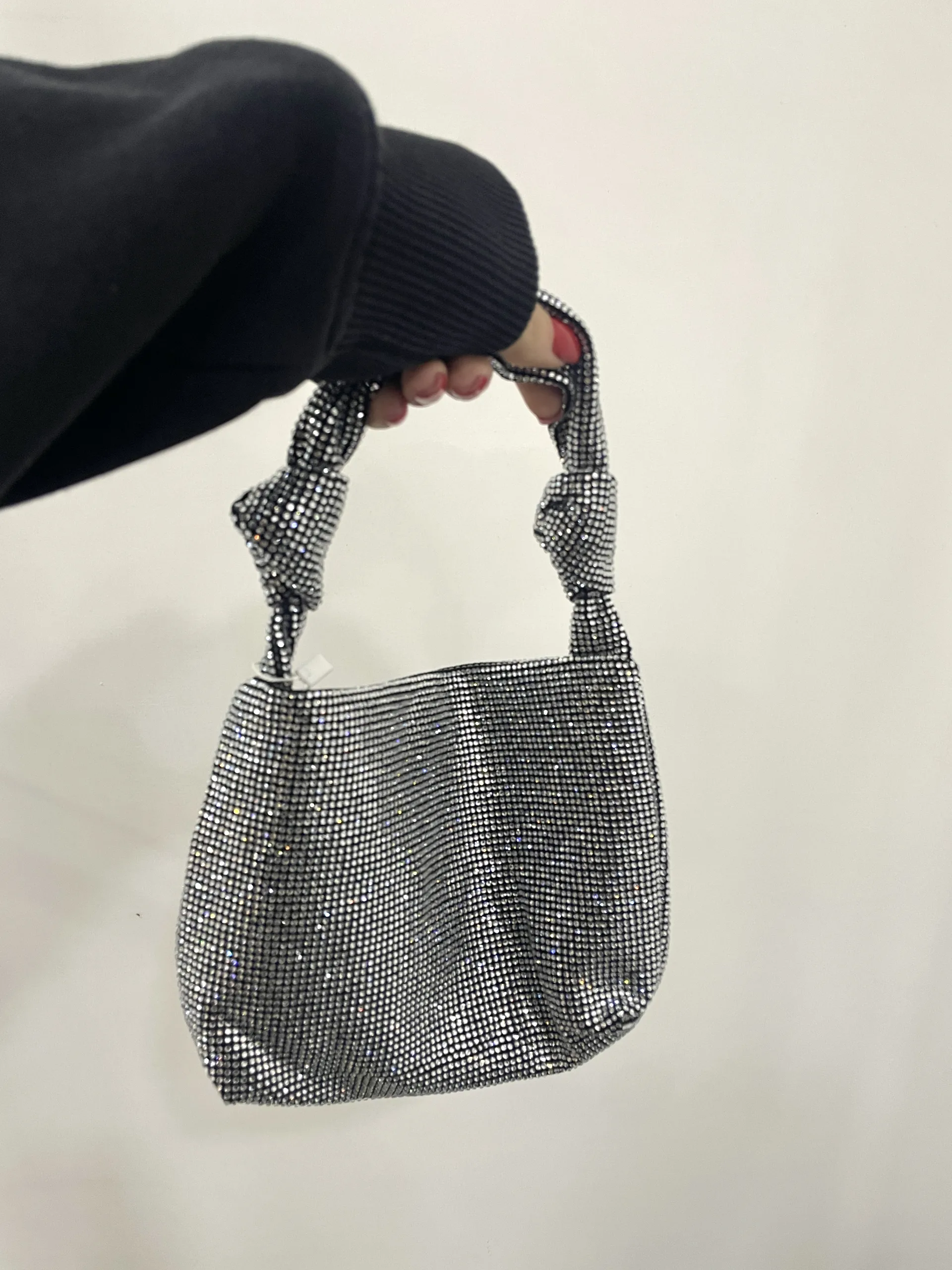 Borsa luminosa con manico annodato e tracolla inclusa, perfetta per aggiungere un tocco brillante ai tuoi look day & night.