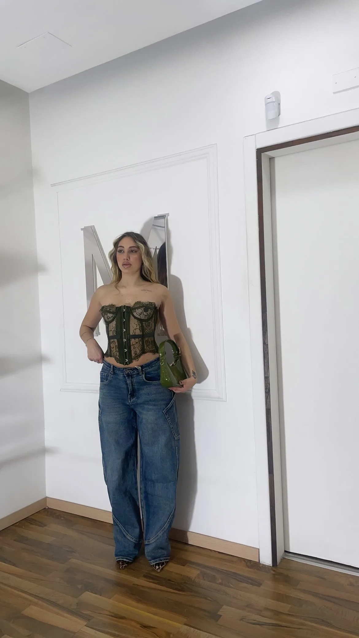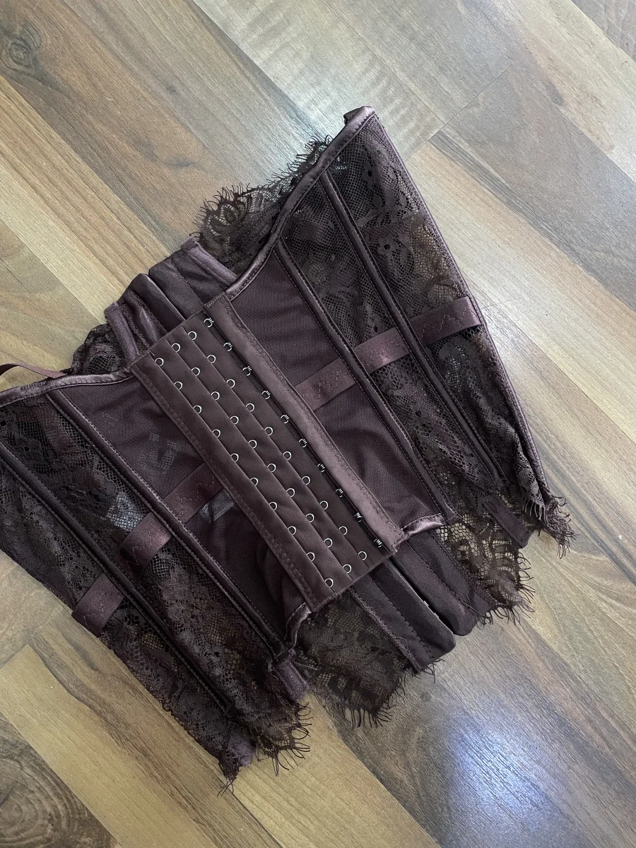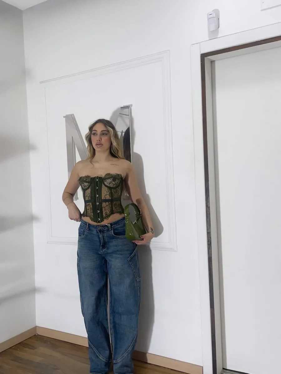 Corsetto verde in pizzo dal design femminile e sensuale, con struttura modellante che valorizza il punto vita e la silhouette. Dettagli in trasparenza e finiture curate per un effetto elegante ma deciso.