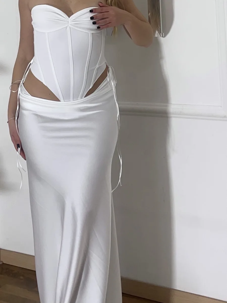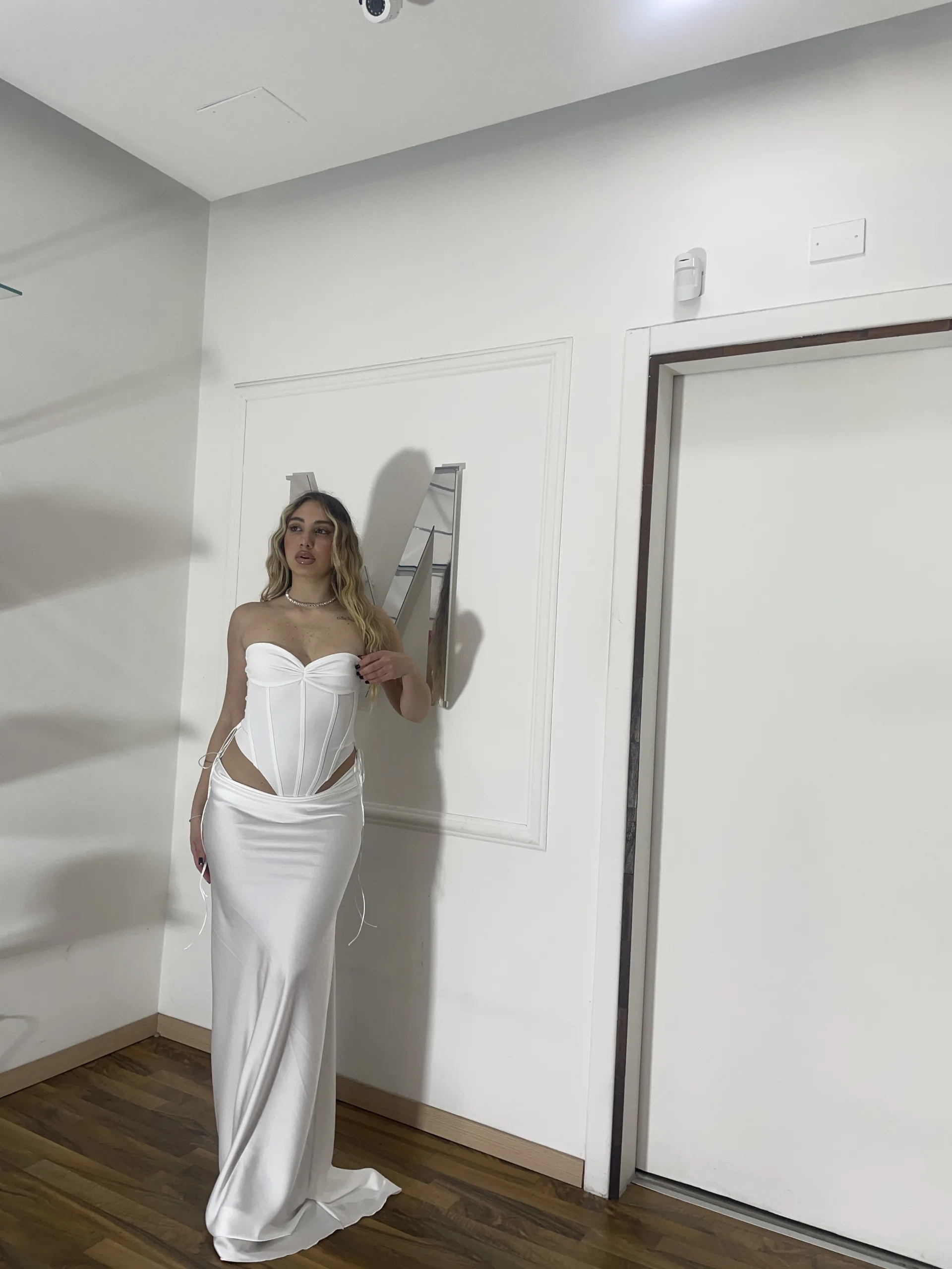 Il modello presenta body interno con chiusura, dettaglio che garantisce maggiore stabilità, comfort e vestibilità perfetta. La struttura aderente sul busto si unisce a una gonna lunga fluida che dona eleganza e movimento.