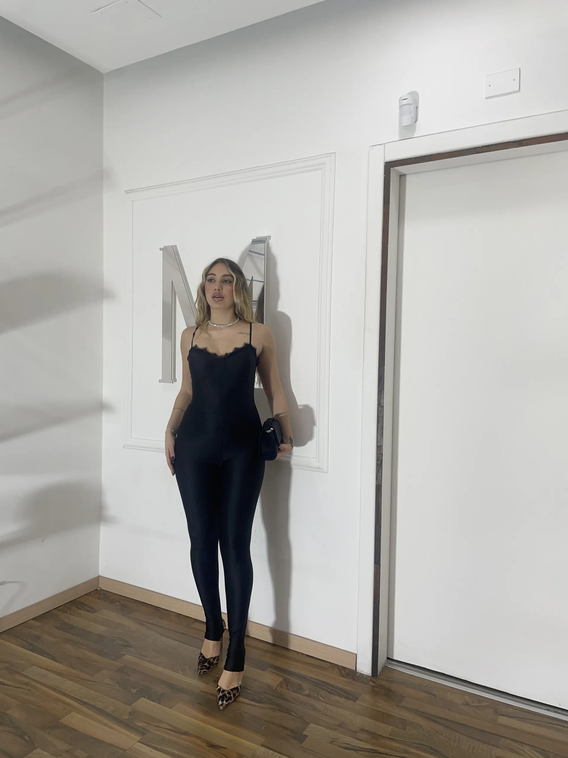 Realizzata in tessuto elasticizzato effetto seconda pelle, avvolge la silhouette in modo armonioso definendo punto vita e fianchi