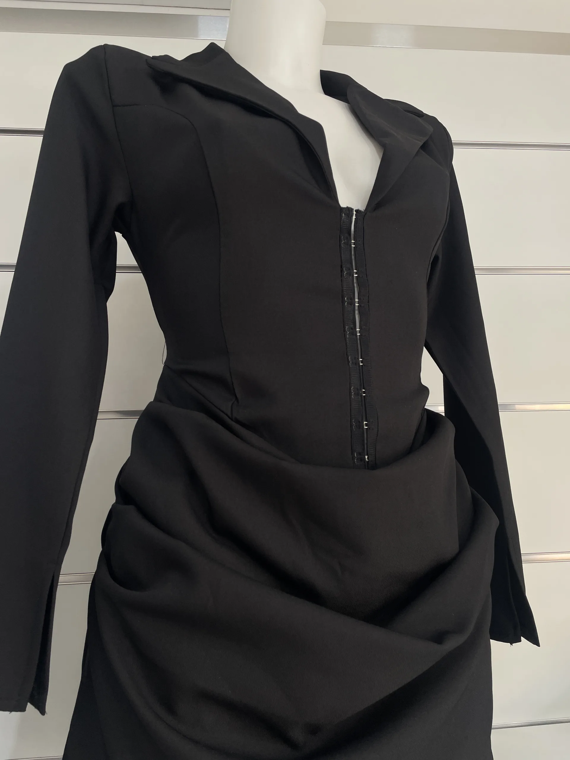 Mini abito nero dal taglio strutturato con colletto stile blazer e chiusura frontale con ganci. Parte inferiore leggermente drappeggiata avanti e dietro. Taglia unica.