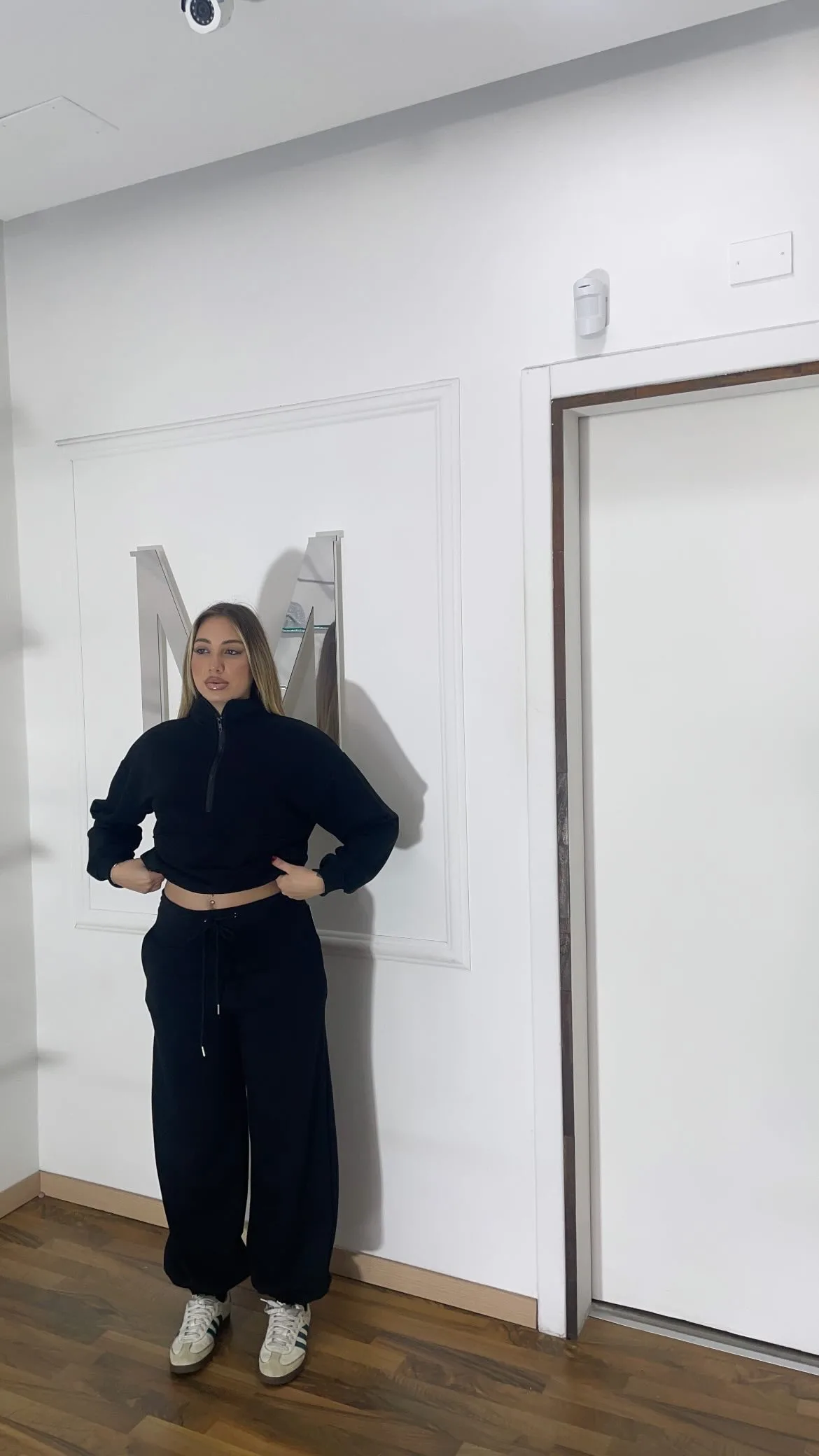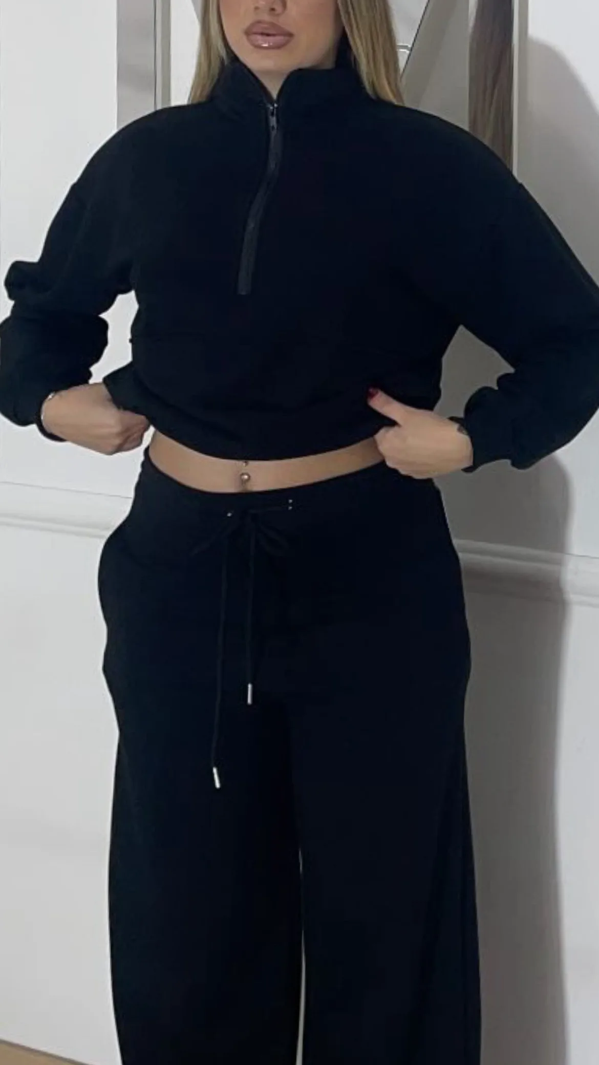 Set coordinato nero felpa con zip e pantaloni a gamba ampia con coulisse taglia unica