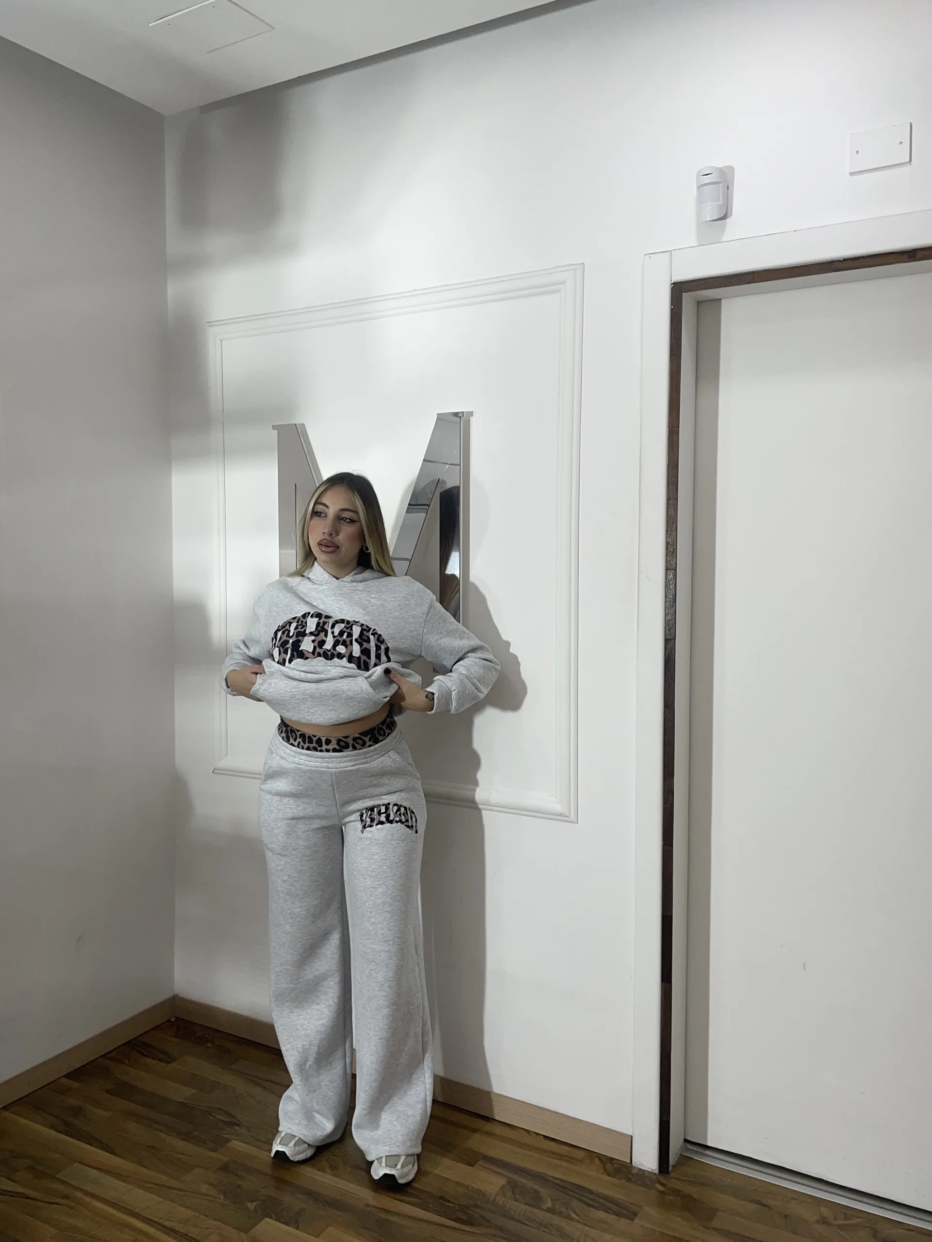 Set felpa e pantaloni con dettagli leopard. Vestibilità morbida, taglia unica.