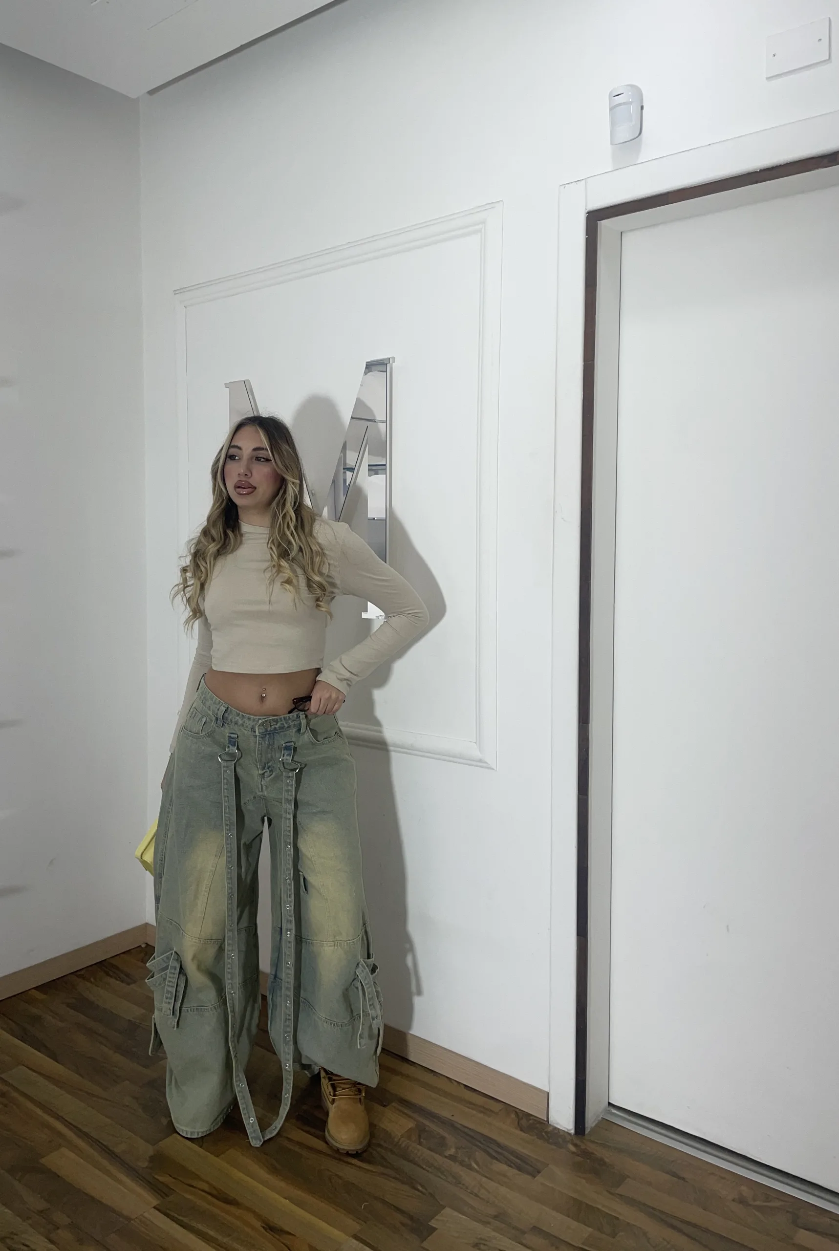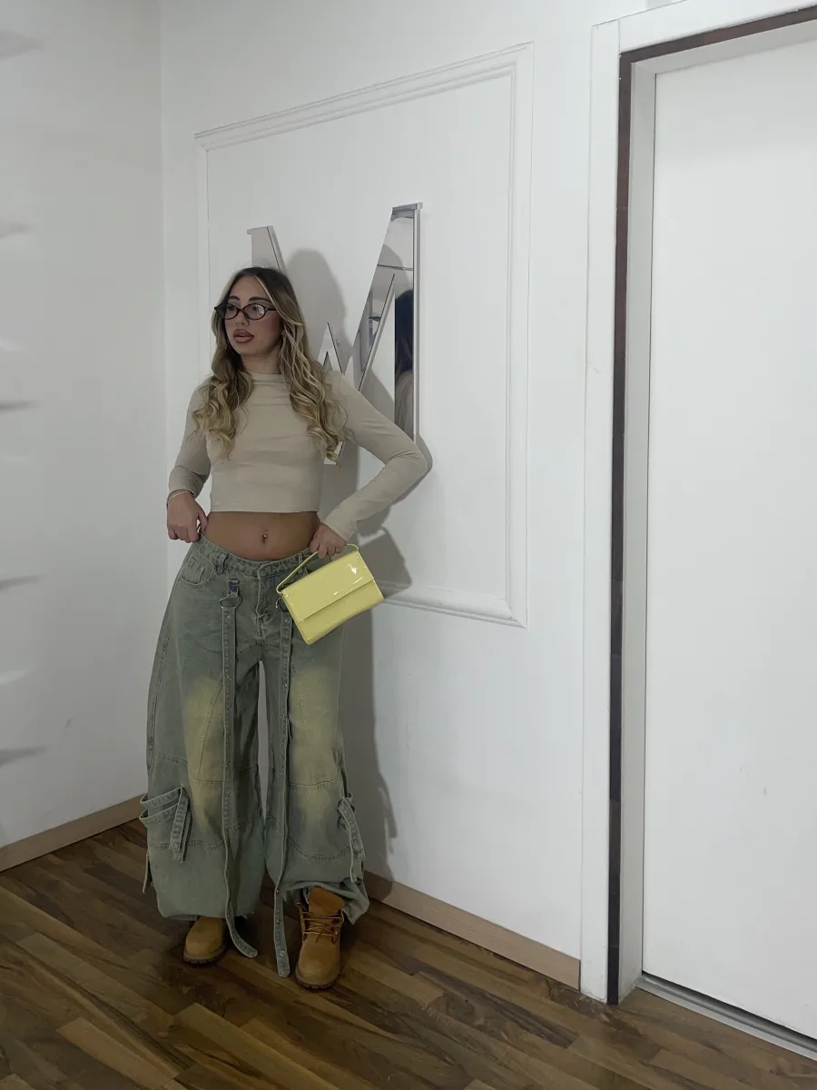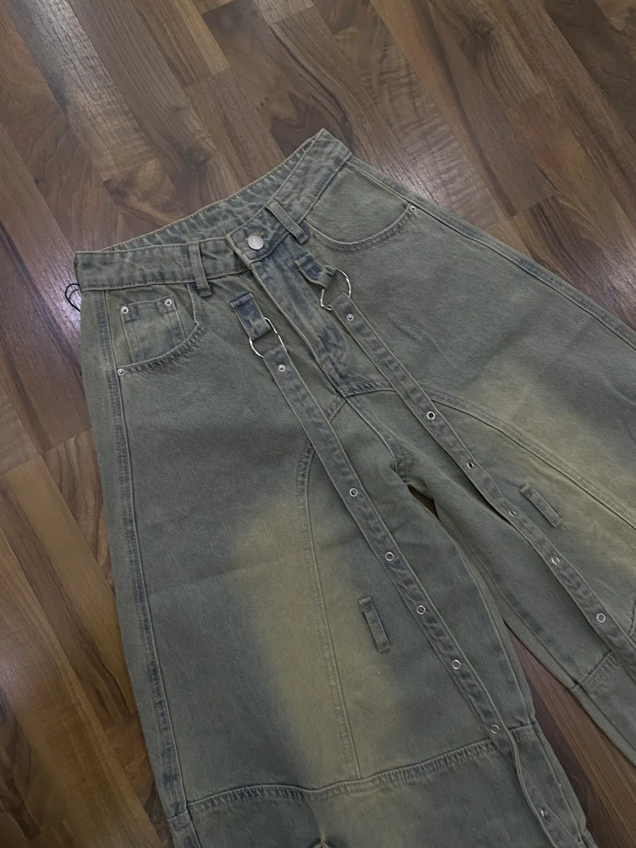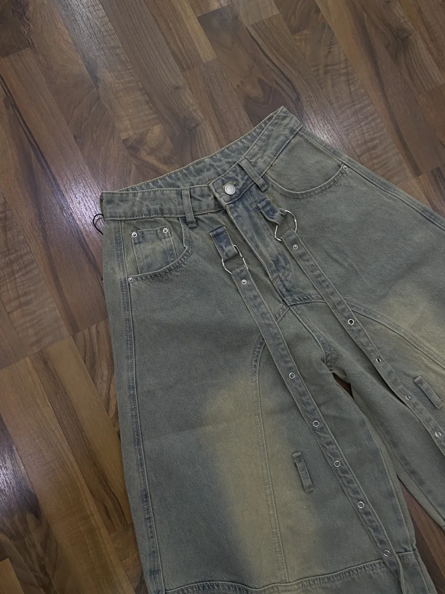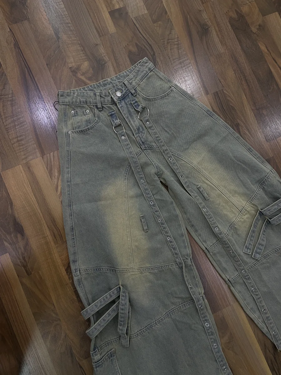 Jeans cargo a gamba ampia con strap decorative regolabili. Stile urban deciso, perfetto per look street e contemporanei.