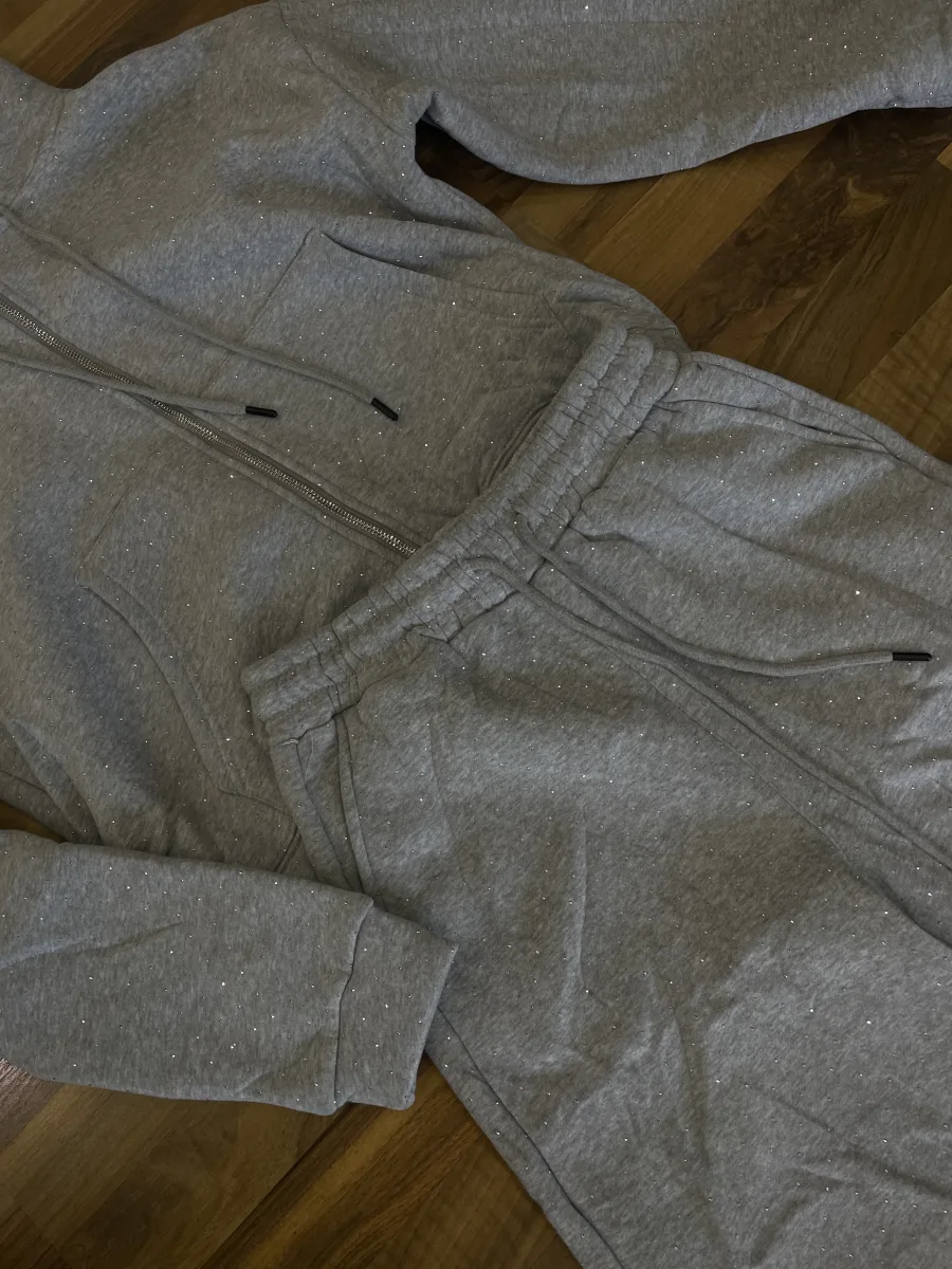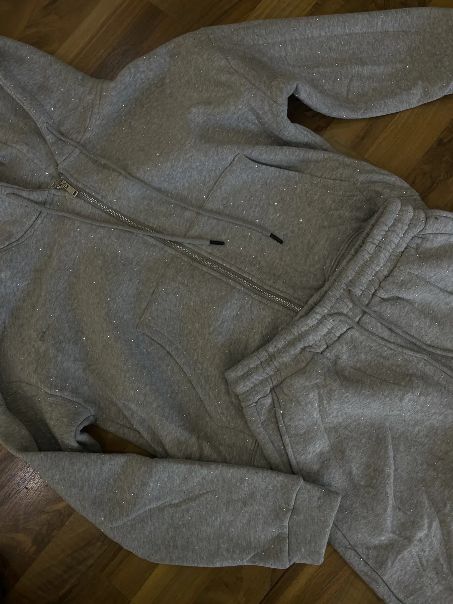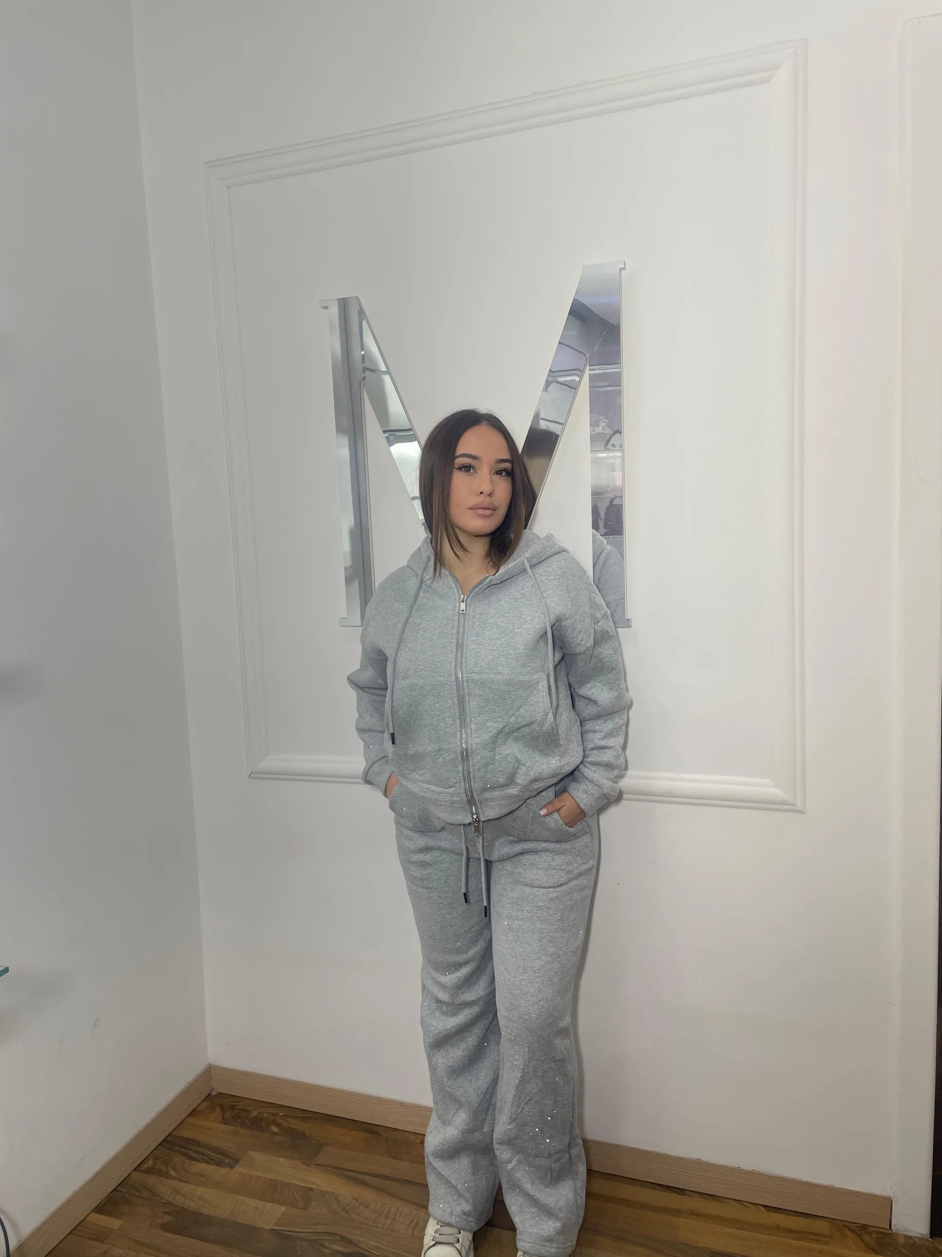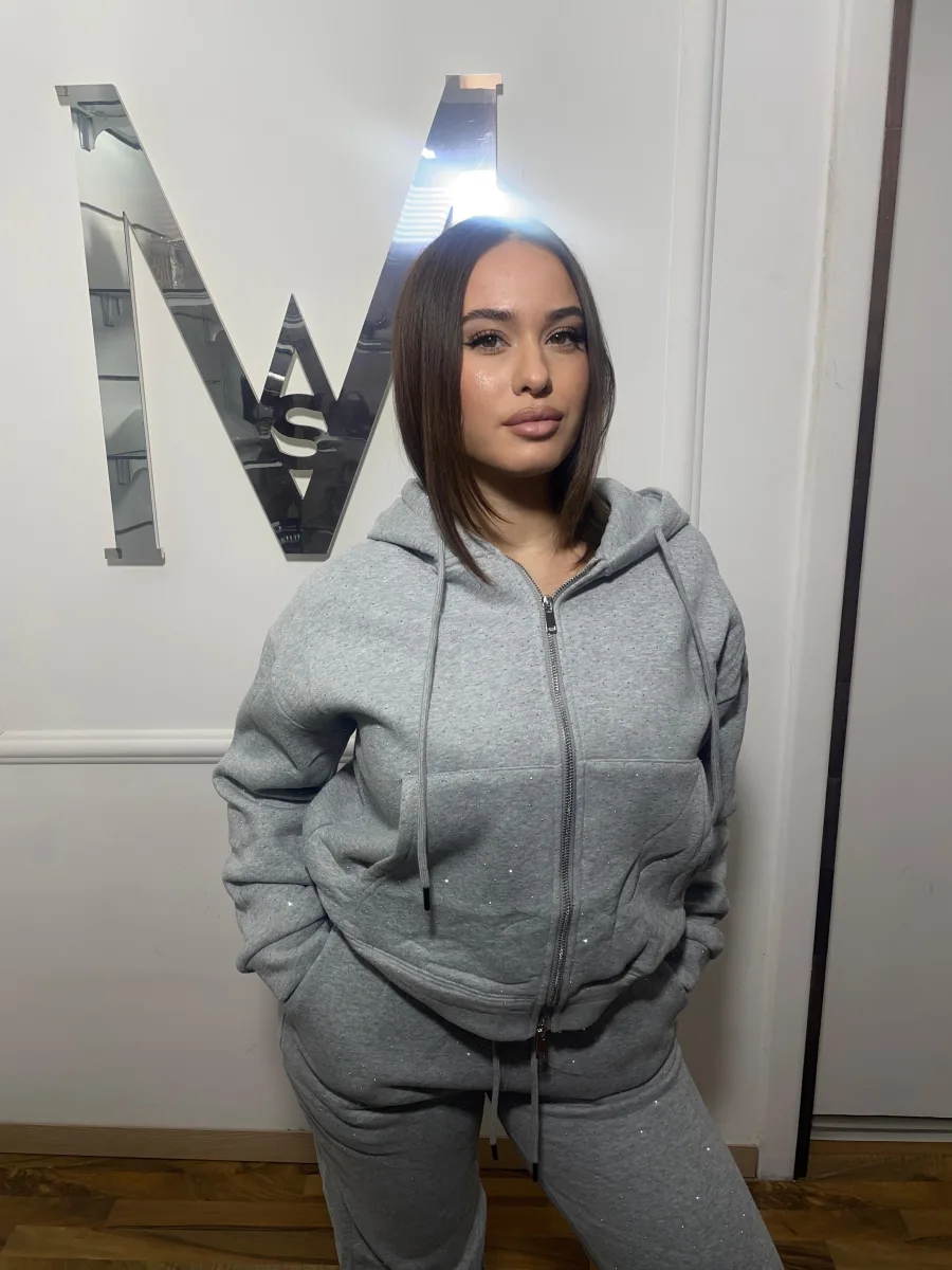 Composta da felpa con zip e cappuccio e pantalone coordinato, unisce comfort e femminilità in un unico outfit.